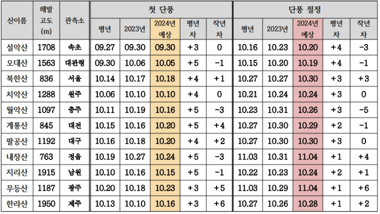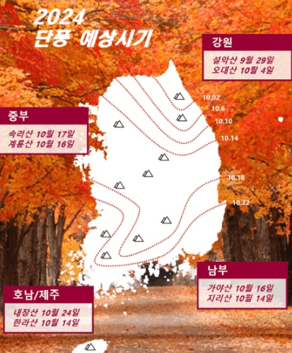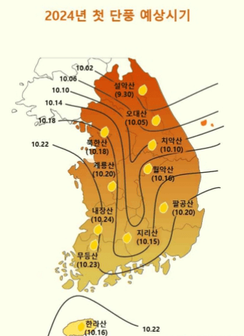 케이 웨더는 전반적으로 첫 단풍시기 늦을거라 예측 했는데 절정 시기는 조금 빠르게 예측 한 것도 있습니다.