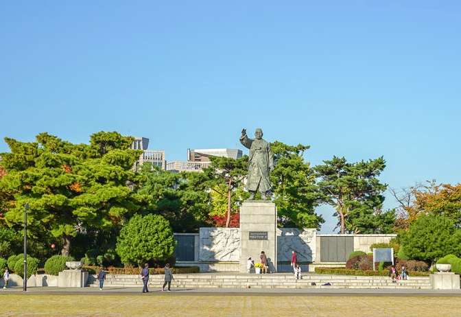 언덕길을 올라오면 김구 선생님 동상 앞으로 양지 바르고 넓은 잔디밭이 펼쳐져요.
