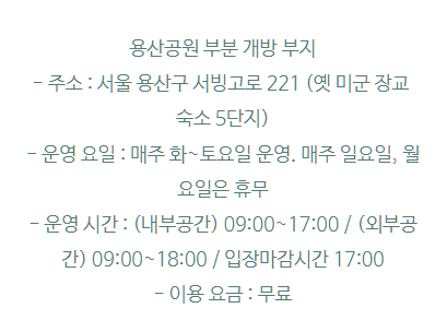 서울단풍명소 용산공원은 매주 화요일부터 토요일까지 방문이 가능합니다. 내부 공간은 오전 9시부터 오후 5시까지, 외부 공간은 오후 6시까지 개방되며, 입장료는 무료랍니다. 하지만 일요일과 월요일은 휴무이니 참고해서 방문하시면 되겠습니다.